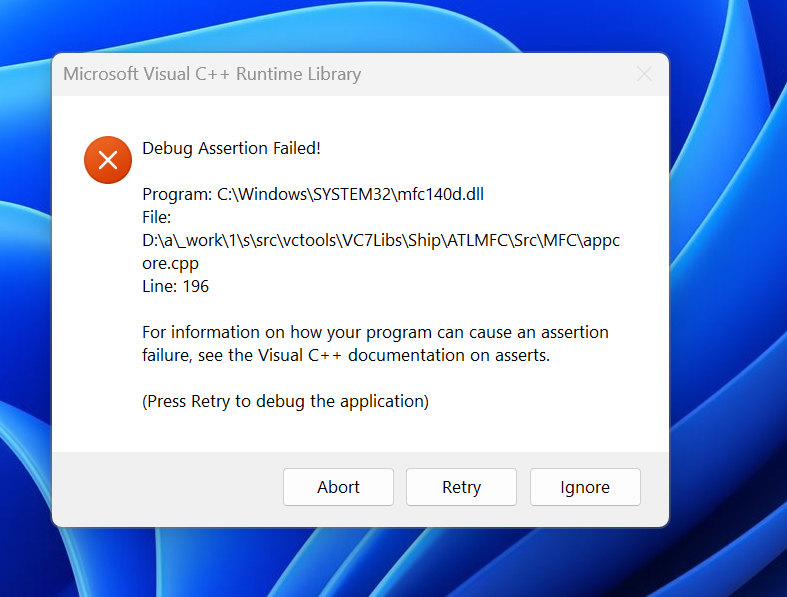 This is a debug-mode assertion from the Microsoft Foundation Classes (MFC) runtime, not a crash in your code per se.