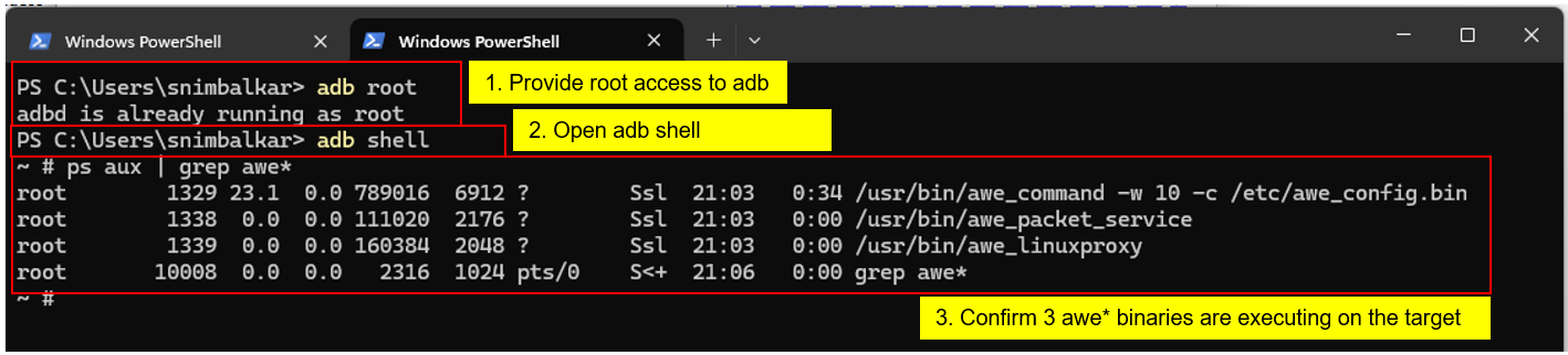 Once you see these processes, you connect to the board via TCP/IP connection with IP address 192.168.1.1 in AWE Server.